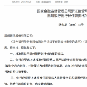 机构之家关注到,2月25日,国家金融监管总局浙江监管局公告显示,洪益平温州银行副行长任职资格已获核准。这位杭州分行行长,随着监管一纸批复,正式走马上任总行管理要职。