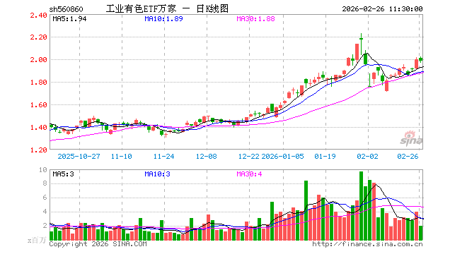 2月26日,截止午间收盘,工业有色ETF万家(560860)跌0.85%,报1.982元,成交额4.01亿元。工业有色ETF万家(560860)重仓股方面,洛阳钼业截止午盘跌1.58%,北方稀土跌1.19%,中国铝业跌0.30%,云铝股份跌1.24%,江西铜业跌1.34%,兴业银锡跌1.24%,铜陵有色跌1.55%,西部矿业跌1.11%,厦门钨业涨0.39%,天山铝业跌2.84%。