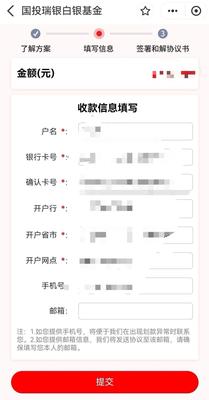 4. 投资者同意和解后,可进入下一步,填写收款信息,如户名、银行卡号、确认卡号、开户行、开户省市、开户网点等必要信息。