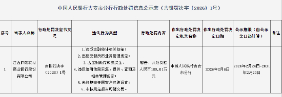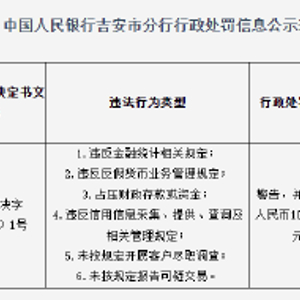 江西庐陵农村商业银行被罚109.81万元:违反金融统计相关规定等