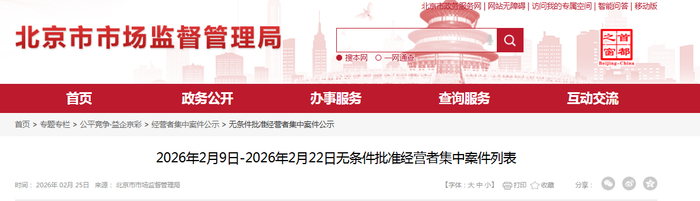 2026年2月9日-2026年2月22日无条件批准经营者集中案件列表