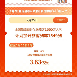 据中国国家铁路集团有限公司2月25日消息,2月24日(正月初八),全国铁路发送旅客1810.1万人次,连续5天保持在1500万人次以上,2月2日春运启动以来累计发送旅客3.13亿人次,运输安全平稳有序。2月25日(正月初九),全国铁路预计发送旅客1665万人次,计划加开旅客列车1549列。