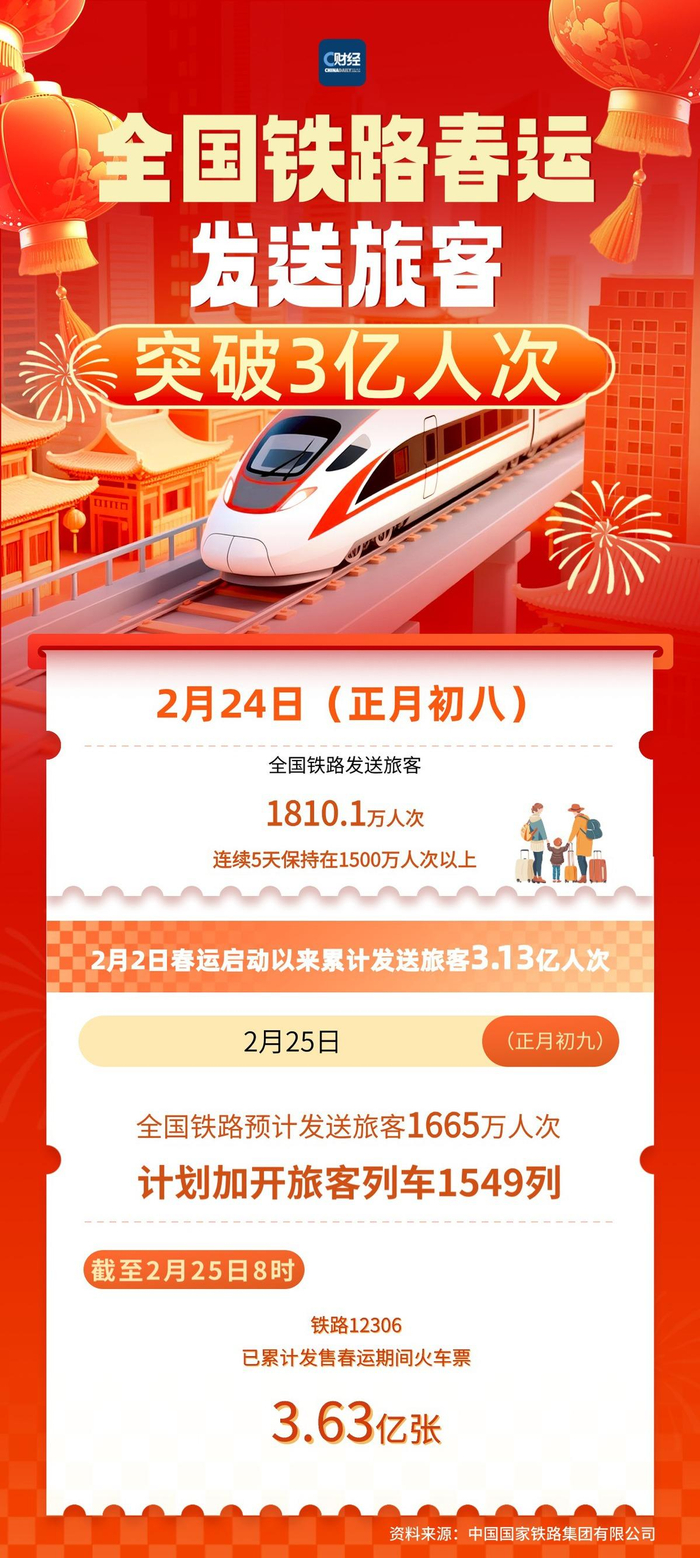 C财经 | 全国铁路春运发送旅客突破3亿人次