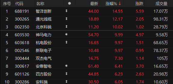 2月26日,电网设备板块再度上扬。智洋创新、通光电缆涨超10%,北京科锐、神马电力、杭电股份等涨停。