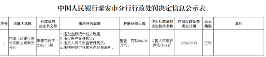 工商银行泰安分行被罚64.05万元:违反金融统计相关规定等
