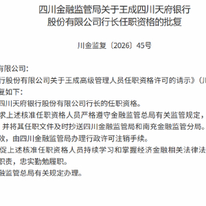 2月26日金融一线消息,四川金融监管局发布批复,核准王成四川天府银行股份有限公司行长的任职资格。