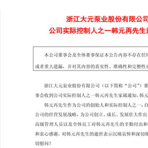 2月25日收盘后,浙江温岭上市公司大元泵业发布公告,公司董事会收到公司实际控制人之一韩元再先生家属通知,韩元再先生于近日不幸逝世。
