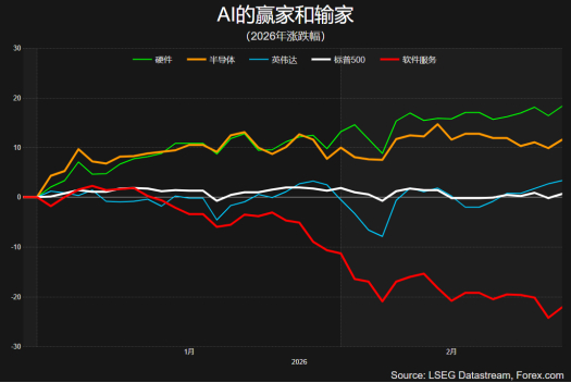 强劲的业绩和指引有望暂时缓解投资者对AI泡沫的担忧,但AI对相关行业造成的冲击(尤其是软件行业)仍需要时间修复。若占标普500超三成权重的科技板块无法恢复强势,大盘很难获得上行动力,更无法追赶亚太和欧洲股市的涨幅。