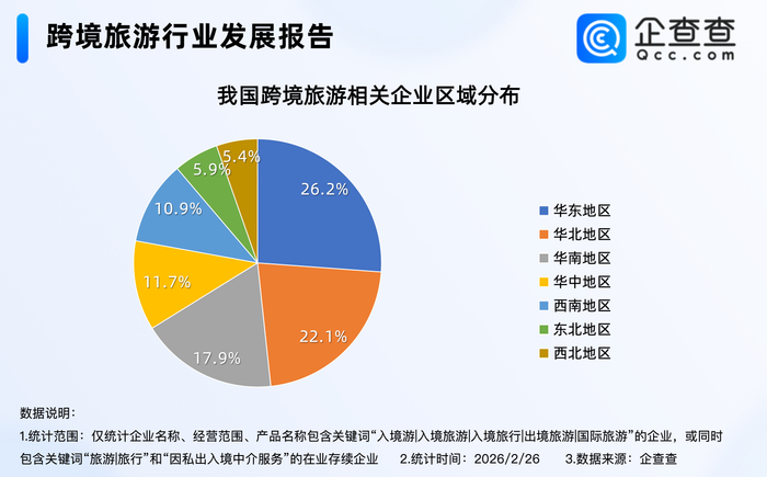 企查查数据显示,截至2月26日,我国现存11.5万家跨境旅游相关企业,区域分布上,华东地区最多,占比26.2%。注册量方面,2021年以来,我国跨境旅游相关企业注册量逐渐稳定在1万家以上,2023-2025年连续三年每年注册量均超1万家。其中2025年全年跨境旅游相关企业注册量达1.25万家;区域分布上,与企业存量区域分布不同的是,2025年注册的1.25万家跨境旅游相关企业中,分布在华北地区的相关企业最多,占比25.0%,其次是华东地区,占比24.2%。