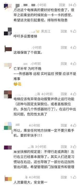 随后,运营单位会同维保公司对五角场广场剩余16部扶梯做停运处理并连夜开展安全隐患排查,以确保使用安全。目前除1号口上行电梯需要更换零部件(需要2-3天,已设置检修提示),其余16部电梯均已检测完毕,可正常运行。