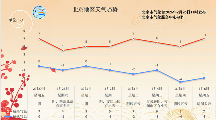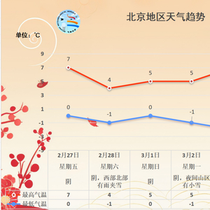 根据预报,明后两天京城天空云量依旧较多,周六西部北部地区还会有雨夹雪;阴云笼罩,气温也逐渐下滑,白天最高气温在4℃~7℃,外出请注意防范。