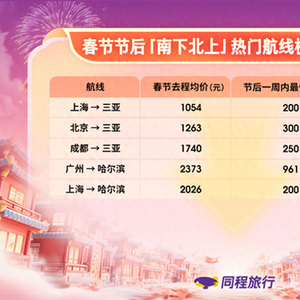 机票方面,“南下避寒”与“北上冰雪”热门航线机票价格降幅显著。节后一周,上海飞三亚机票从春节假期的均价1054元(不含机建燃油费,下同)降至最低200元,降幅达81%;北京飞三亚机票从春节假期的均价1263元下滑至最低300元,降幅达76%;广州飞哈尔滨机票从春节假期的均价2373元跌至最低961元,降幅达60%;上海飞哈尔滨机票从春节假期的均价2026元跌至最低200元,降幅达90%。