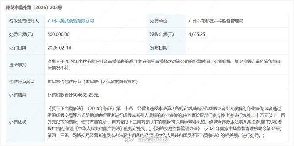 近日,因存在虚假宣传违法行为,去年深陷舆论风波的“美诚月饼”品牌运营方——广州市美诚食品有限公司收到广州市花都区市场监督管理局开出的行政处罚单。该公司因在2024年中秋节前直播销售中,对公司经营时间、规模、知名度等作引人误解的商业宣传,被合计罚没约50.46万元。
