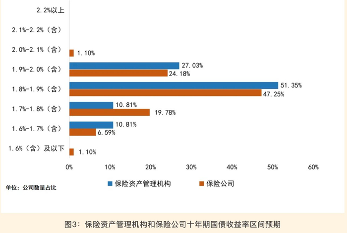 根据调查结果,利率债方面,预计10年期国债收益率将处于1.8%~1.9%区间,30年期国债收益率将集中在2.2%~2.4%区间。信用债方面,超半数保险机构预计高等级信用债收益率中枢处在2.0%~2.5%区间,信用利差整体将呈现震荡趋势。