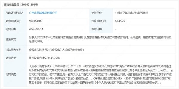 近日,因存在虚假宣传违法行为,去年深陷舆论风波的“美诚月饼”品牌运营方——广州市美诚食品有限公司收到广州市花都区市场监督管理局开出的行政处罚单。该公司因在2024年中秋节前直播销售中,对公司经营时间、规模、知名度等作引人误解的商业宣传,被合计罚没约50.46万元。