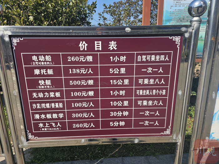 此外,电动船、摩托艇、快艇、无动力桨板等价格也都在100元/艘(人)以上,可乘坐4人、6人、8人不等。