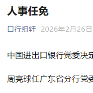 2月26日金融一线消息,据“口行组轩”微信公众号,中国进出口银行党委决定:周亮球任广东省分行党委书记、行长。