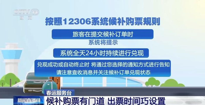 据央视新闻消息,近日有网友反映,春运返程候补购票,凌晨3点才收到候补成功通知,因熟睡未及时查看,醒来时列车已发车,车票无法全额退款。国铁集团有关负责人解释,目前候补购票可以24小时兑现,但旅客填写候补订单时需注意设置兑现时间。