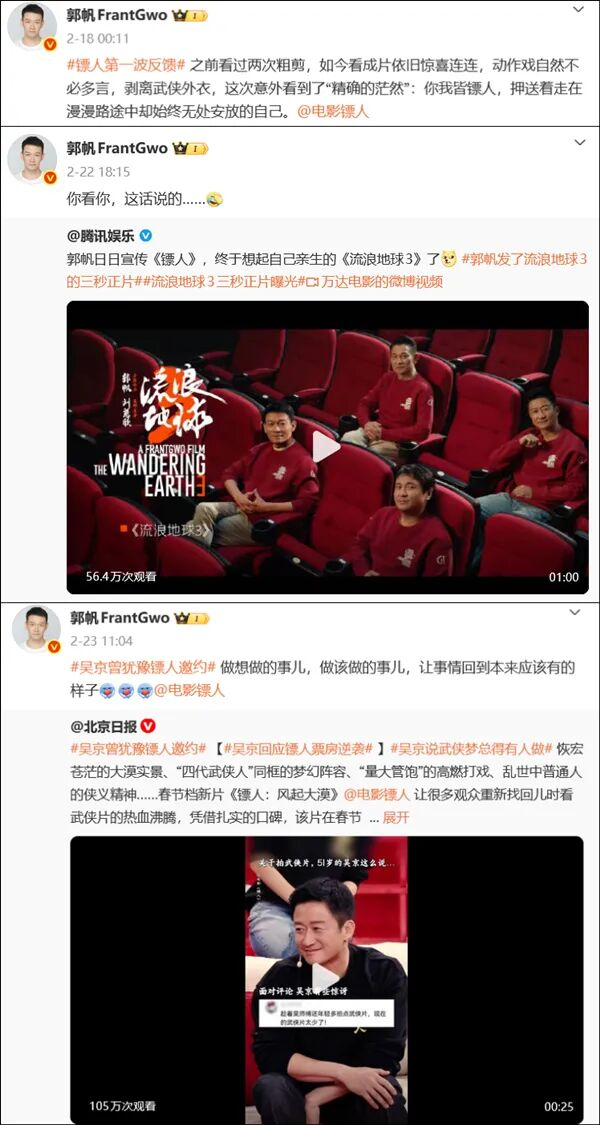 2月起,在山东紧锣密鼓拍摄《流浪地球3》的郭帆,硬是把自己的微博整成了《镖人》的宣传号,连发十几个安利帖,不遗余力称赞《镖人》,庆祝《镖人》票房逆跌,还在包场春节档电影时用倍数“区别对待”——给《星河入梦》包3场,给沈腾主演的《飞驰人生3》包6场,给《镖人》包9场。