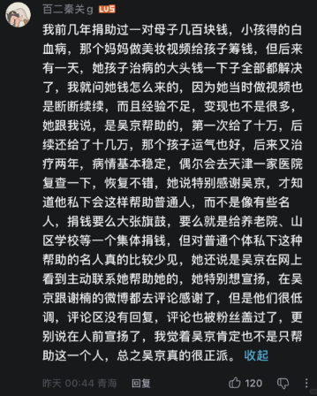 吴京曾经默默做过的事开始浮现:长期做慈善、帮助普通人、提携后辈、在执导的电影里屡次为强大的女性角色提供一席之地、助力中国科幻电影人追梦……这些曾经被淹没的信息,在作品立住之后,慢慢有机会被大众看见。