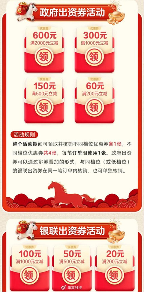 银联出资券同步配套满200减20、满500减50、满1000减100三档补贴。根据规则,银联券可与同档位或低档位的政府出资券在同一笔订单内叠加核销,也可单独使用。