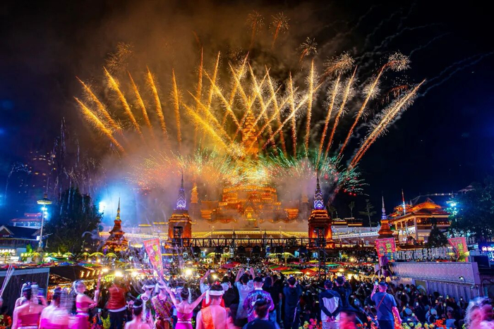 当夜幕降临,星光夜市灯火璀璨,大金塔上空的新春烟花秀如期绽放,照亮了澜沧江畔的浪漫夜空。