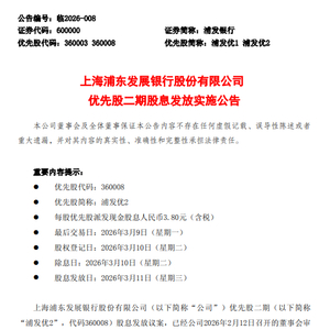 2月26日金融一线消息,浦发银行公告称,该行优先股二期(以下简称“浦发优2”,代码360008)股息发放议案,已经公司2026年2月12日召开的董事会审议通过。