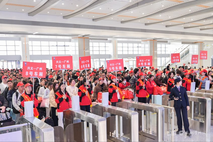 今年农历正月初六中午,兴义南站广场上人潮涌动,1100多名务工群众拿着行李有序地排起了长队,等着搭乘免费务工专列,分赴广州、杭州等地,开启新一年的增收之旅。