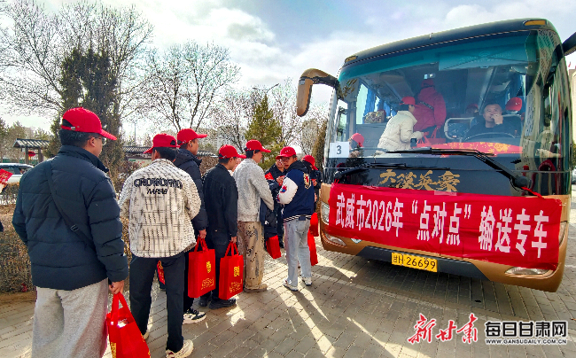 新甘肃客户端武威2月26日讯(新甘肃·甘肃日报记者 金奉乾)人勤春来早,逐梦踏征程。今天下午,武威市举行2026年春风行动“点对点”有组织输转及返岗复工人员集中欢送仪式,首批230名务工人员统一乘坐大巴车,“点对点、一站式”奔赴内蒙古、新疆、江苏等地,开启返岗复工新征程。