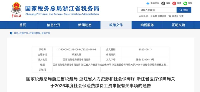 1月22日,浙江省税务局发布《关于2026年度社会保险费缴费工资申报有关事项的通告》。