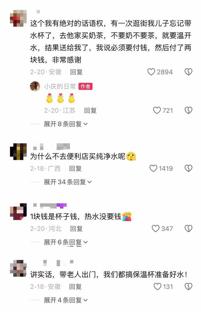评论中,不少网友称赞蜜雪冰城服务贴心,也有网友分析认为,1元收费并非水费,而是杯子等耗材成本。与此同时,也有网友提出不同看法,认为奶茶店并无提供白开水的义务,外出时可自行携带水杯,或前往便利店、饭店等场所解决饮水需求。
