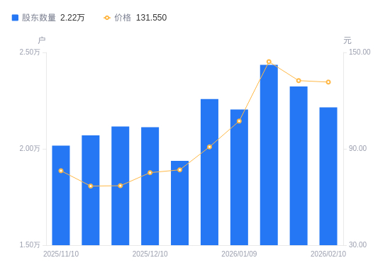 近一年(2025年2月20日至2026年2月13日),精测电子A股股东户数从2.49万户,减低至2.3万户,降幅7.39%,区间股价上涨117.29%。