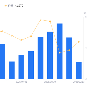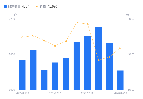 近一年(2025年2月20日至2026年2月13日),山水比德A股股东户数从6966户,减低至4587户,降幅34.15%,区间股价上涨82.14%。