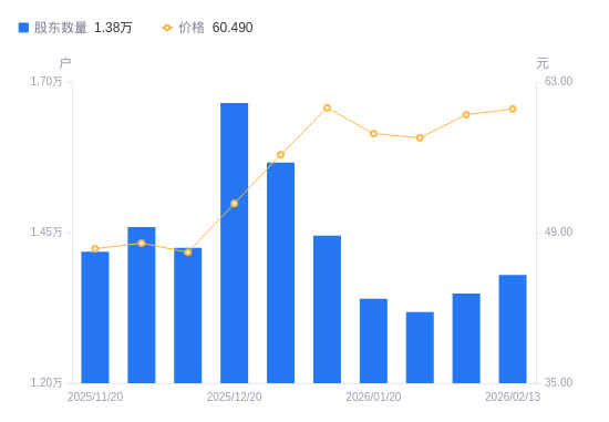近一年(2025年2月20日至2026年2月13日),光庭信息A股股东户数从1.7万户,减低至1.38万户,降幅18.89%,区间股价上涨11.83%。