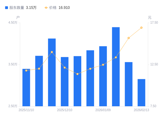 近一年(2025年2月28日至2026年2月13日),华自科技A股股东户数从4.63万户,减低至3.15万户,降幅31.92%,区间股价上涨78.94%。