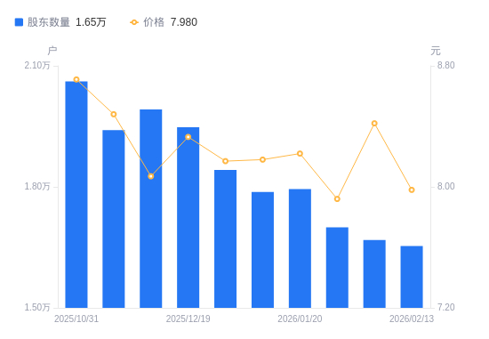 近一年(2025年2月28日至2026年2月10日),安正时尚A股股东户数从1.52万户,增加至1.67万户,增幅9.85%,区间股价上涨53.62%。