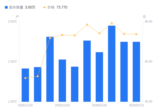 2月26日消息,数据显示,截至2026年2月13日,中瓷电子A股股东总户数为3万户,较上期(2026年2月10日)不变。公司最新A股总股本为4.51亿股,其中流通A股3.4亿股,户均持有流通A股数量为1.13万股,较上期不变;户均持流通A股市值83.72万元,较上期减少1475.34元,降幅0.18%。