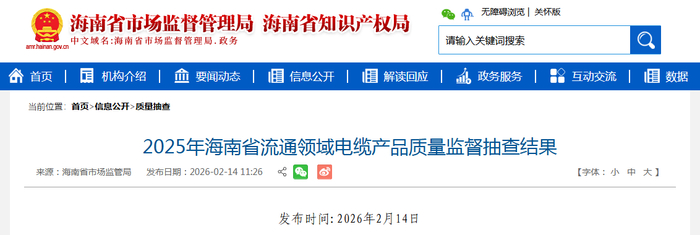 中国质量新闻网讯 据海南省市场监督管理局网站消息,2025年第4季度,海南省市场监督管理局对全省流通领域电缆产品进行了监督抽查。本次抽查了13批次产品,经检验,不合格1批次。