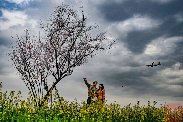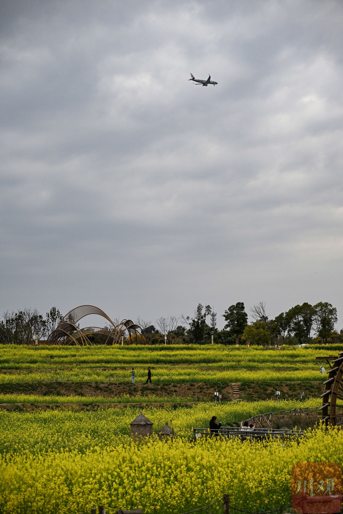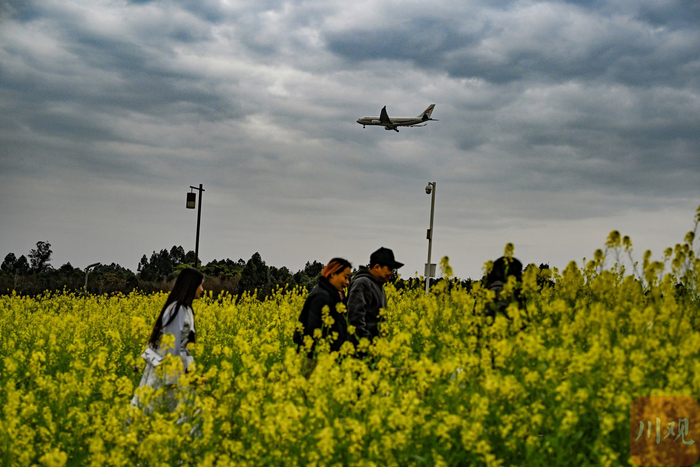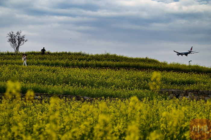 油菜花附近的机场跑道上,每隔几分钟便有飞机在此起降,不同机身的色彩与花海的金黄相互映衬,构成了一幅动静相宜的“春日画卷”。花海中的游客见到飞机纷纷摆出各种姿势与飞机合影。油菜花加飞机,成了成都特有的景观。