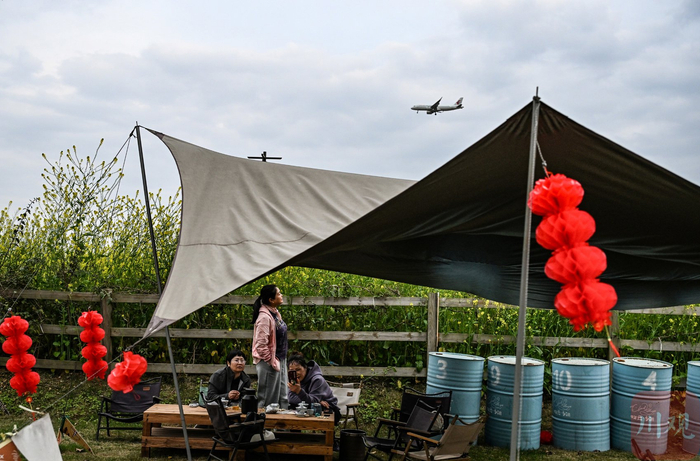 2026年2月26日,成都双流黄水镇,市民在油菜花海旁露营休闲,与上空起降的飞机相映成趣。