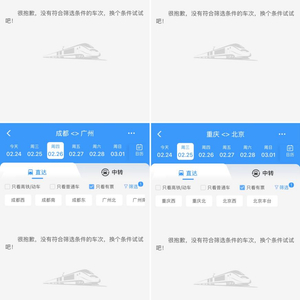 2月24日~27日从重庆出发到广州的高铁已全部售罄,图源:12306