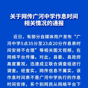 甘肃广河县通报“广河中学作息时间安排不合理”:不属实,5名违法人员被处理 环球网 环球网官方账号 02.2623:00 关注 本文转自【广河发布】;2月26日,甘肃广河县教育局发布《关于网传广河中学作息时间相关情况的通报》:
