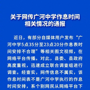近日,有部分自媒体用户发布“广河中学5点35分至23点20分作息表时间安排不合理”等相关图文视频,在网络平台传播。对此,县委、县政府高度重视,迅速成立联合调查组进行调查。经查实,网传信息不属实,该作息时间表不是广河中学执行的作息时间安排,系个别网民从网络平台下载后,通过自媒体平台发布,部分网民添加有广河中学字眼的不实信息和不当言论后转发。2月26日,经广河县公安局依法调查取证,对发布不实信息的5名违法人员依法进行处理。