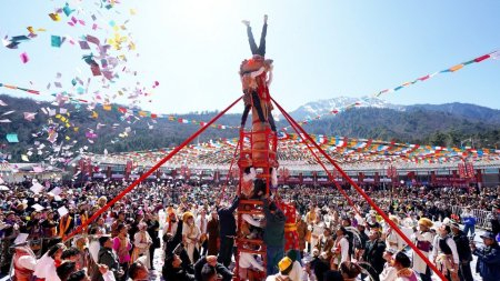 上午10点,硗碛各村寨人员着盛装齐聚神石园祈福祈愿,希望新的一年风调雨顺幸福安康。祈福完毕,由各村组建的巡游队伍从神石园出发前往五寨园。活动在五寨园开幕,龙灯、狮灯、牛灯等表演陆续登场。在所有的节目中,国家级非物质文化遗产多声部民歌和省级非物质文化遗产“天鹅抱蛋”,无疑是最吸引人眼球的。“天鹅抱蛋”作为硗碛传统的体育杂技节目,需要众多表演者用多个木凳、木桌垒4层搭建起表演场地,然后在木凳、木桌上做倒立、倒挂金钩等高难度动作。