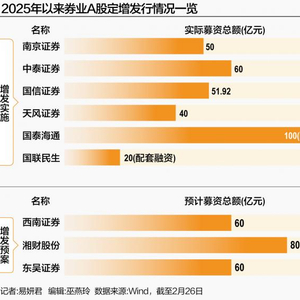 Wind数据显示,按发行日期统计,2025年度,共有6家券商在A股实施定增发行,实际募资总额合计321.92亿元。