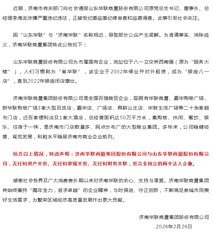 ▶济南华联商厦集团公告: