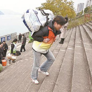 船行两个小时后,靠拢忠县码头。更繁重的工作才刚开始,老人们需要把背篓卸下船,再搬运到100米外的“2180菜农家园”——一个专门为这些菜农设立的免费临时卖菜点。