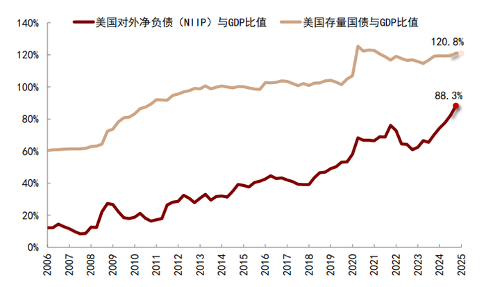 货币秩序重构的根本原因是美国自身资产负债表和特朗普政策冲击,以及中国经济韧性与创新叙事反转。推动重构的力量有多重原因:1)美国自身债务问题。当前美国债务占GDP比重已达120%,对外净投资头寸(NIIP)接近-90%(图表8)。而问题的症结不仅是债务规模,日本债务占GDP比重一度高达250%,却并未引发对其债务可持续性的广泛担忧;中国按照IMF口径计算的公共债务占GDP比重约为120%,也没有明显的债务偿还压力。关键差异在于美国近年的政府和党派都没有表现出主动控制财政赤字的意愿。这在学术文献中被称为“财政反应函数”(fiscal reaction function),正常情况下,随着债务上升,政府应通过提高基础盈余来主动抑制债务扩张,形成对债务规模的负向调节。即使是在日本,安倍经济学推行量化宽松期间,也常通过隔年上调消费税来释放财政约束信号,体现出负责任的政策态度。而美债的核心问题不仅在于发债规模过大,更在于政府没有表现出要约束债务增长的意愿。2)特朗普政策冲击。特朗普在贸易政策、财政政策、货币政策、产业政策、外交政策等多个方面自行拆解了美元体系(图表9)。对于特朗普的各项政策,一种看法认为其政策毫无章法,另一种则认为其政策本质上符合美国利益,捕捉到美国存在的核心问题,只是手段相对强硬,与传统建制派的理念相悖,我们更认同后者。但这种“以邻为壑,竭泽而渔”的做法客观上将会损害美元体系。3)中国韧性与叙事反转。2025年,中国DeepSeek出现打破了美国AI技术垄断,随之而来的是各行各业迎来了“DeepSeek时刻”。中国的开源模型累积下载量于8月超过美国(图表10),意味着全球用户对中国开源模型的认可,优势在于成本低,单位token消耗的算力更低。此外,中国制造业的韧性主要体现在产业长期升级,半导体等关键领域突破以及稀土产业链优势。2025年的一系列事件,包括中美谈判、出口在高额关税压力下保持稳健等,都让全球更清晰地认识到这一优势。中美之间相对实力的变化,根本上动摇了美元霸权。
