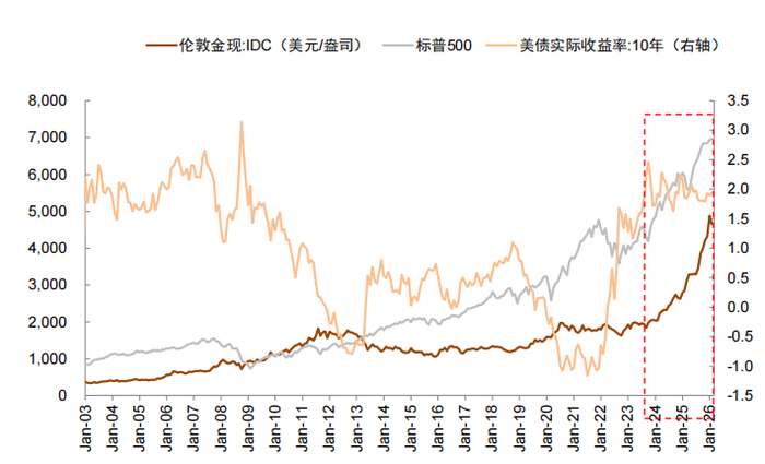 图表5:2022年以来黄金与美股同涨,与实际利率脱锚,无法简单用地缘风险解释上涨