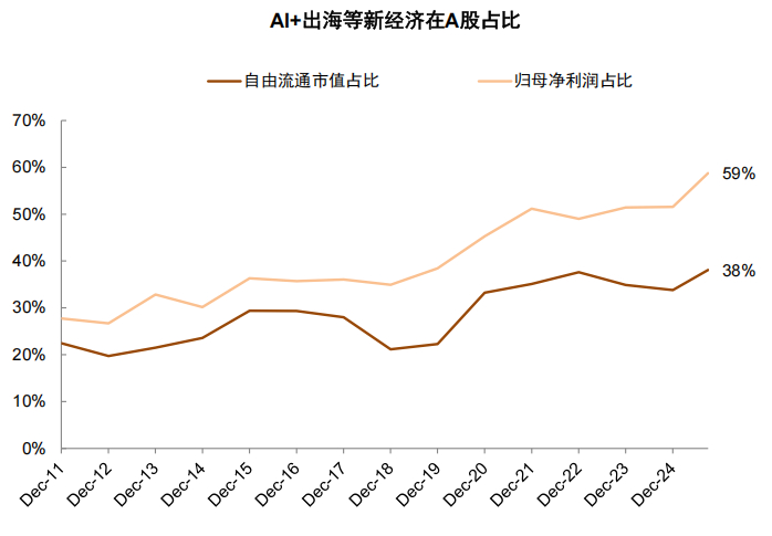 1)基本面上,经济转型和新质生产力驱动形成“新动能”。中国经济周期历来短于全球平均水平,2000年以来中国一轮完整的经济周期平均时长在4年左右,而美国和OECD国家平均分别在8年和6年左右[4]。中国经济周期运转更快,与过去高杠杆发展模式、地方政府土地财政的“财政加速器”效应密切相关。但2017年以来金融周期下行已有8年多,接近8-10年的国际平均水平,房地产行业在经济中的占比已经明显下降。我们认为随着基本面韧性不断增强,周期波动有望趋于平稳。而且新质生产力逐渐成为经济的新驱动力,股市内部行业结构已经在反映这些变化:与AI和出海相关的新经济领域在股市占比不断提升。2025年前三季度新经济领域在非金融企业的盈利占比接近40%,自由流通市值占比已经接近60%,有助于降低股市顺周期波动并提供新的增长动能(图表15)。